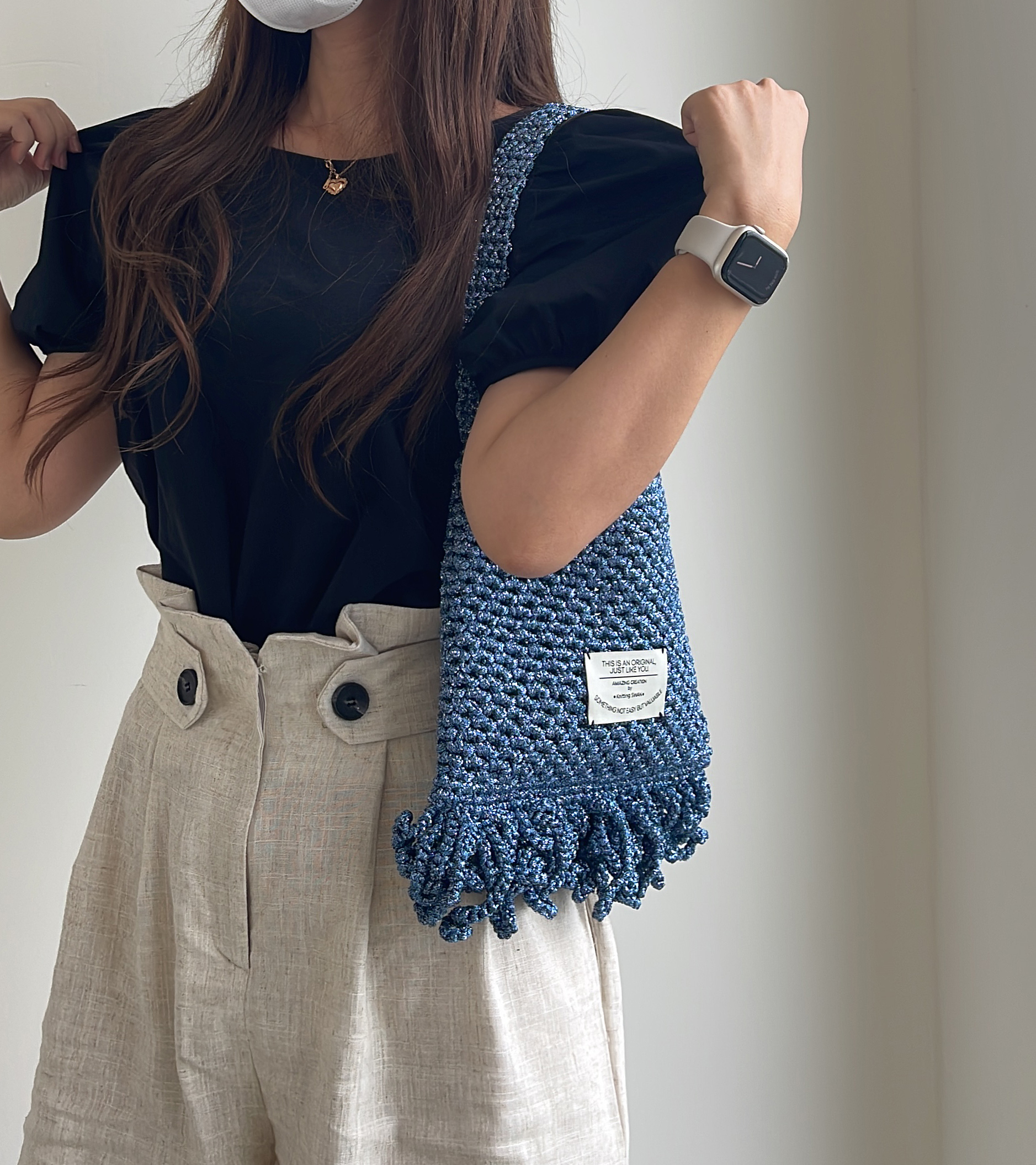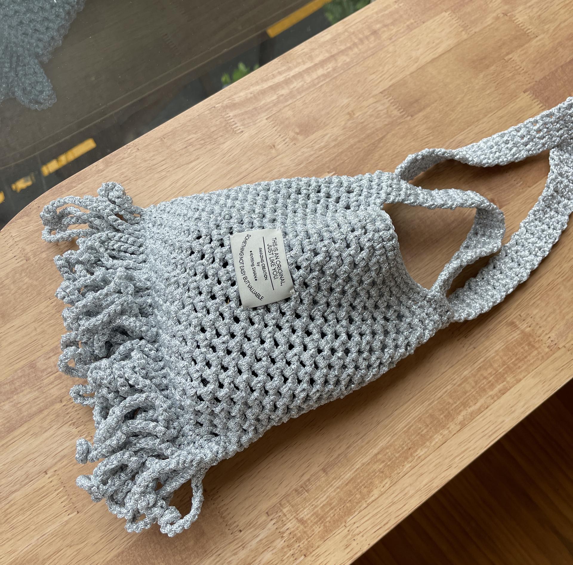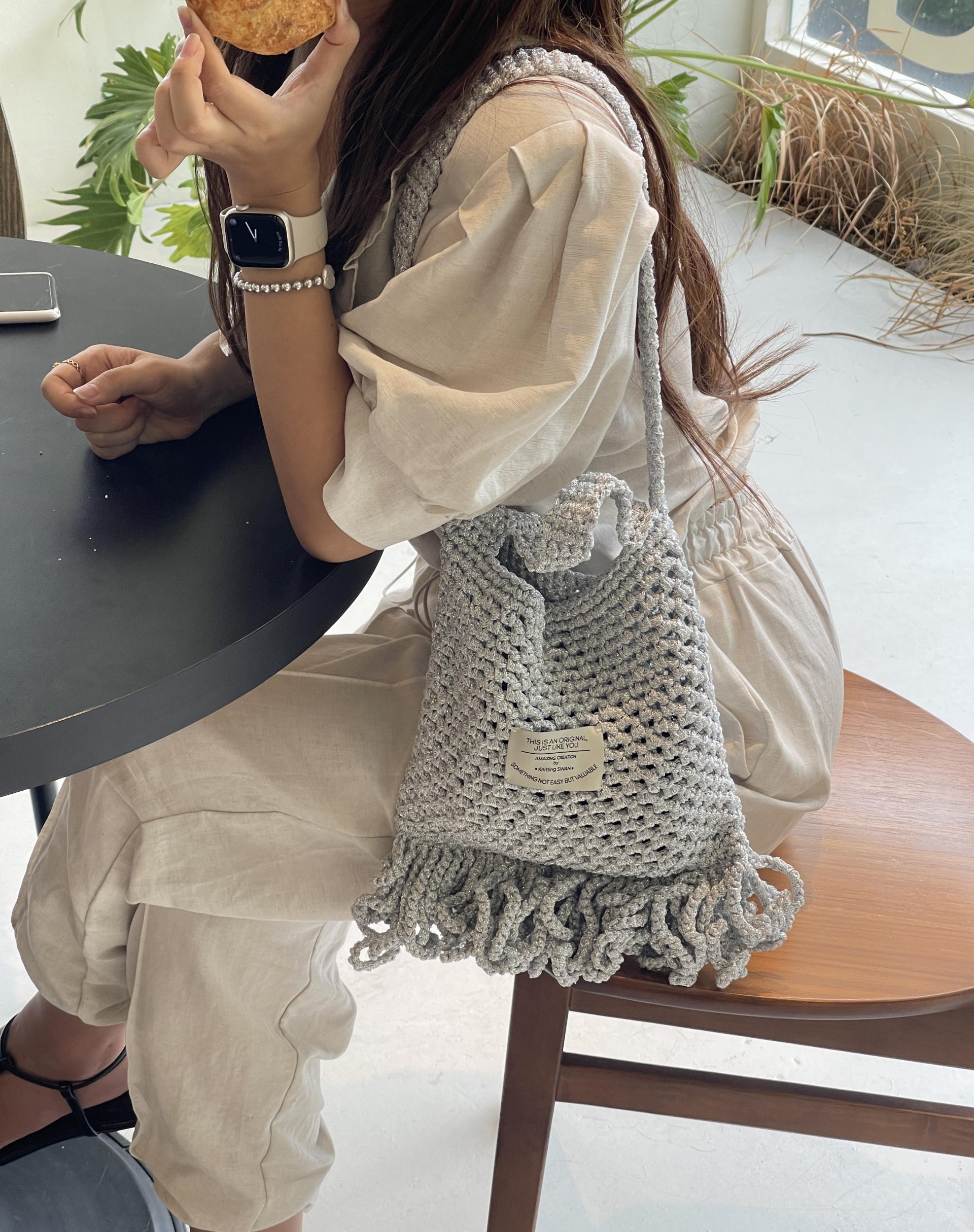 도톰하고 반짝이는실로 촘촘한 그물패턴으로 만드는 가방입니다.