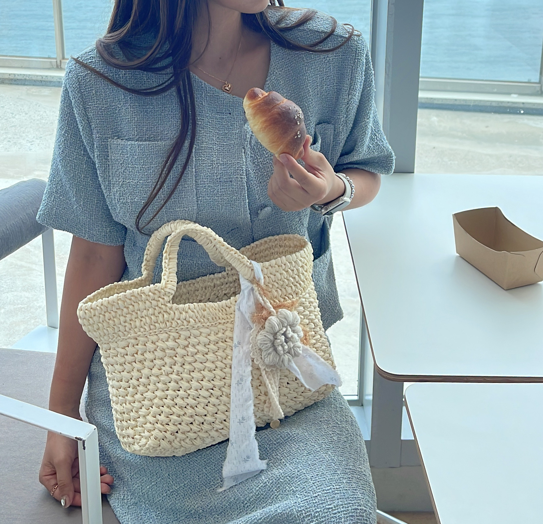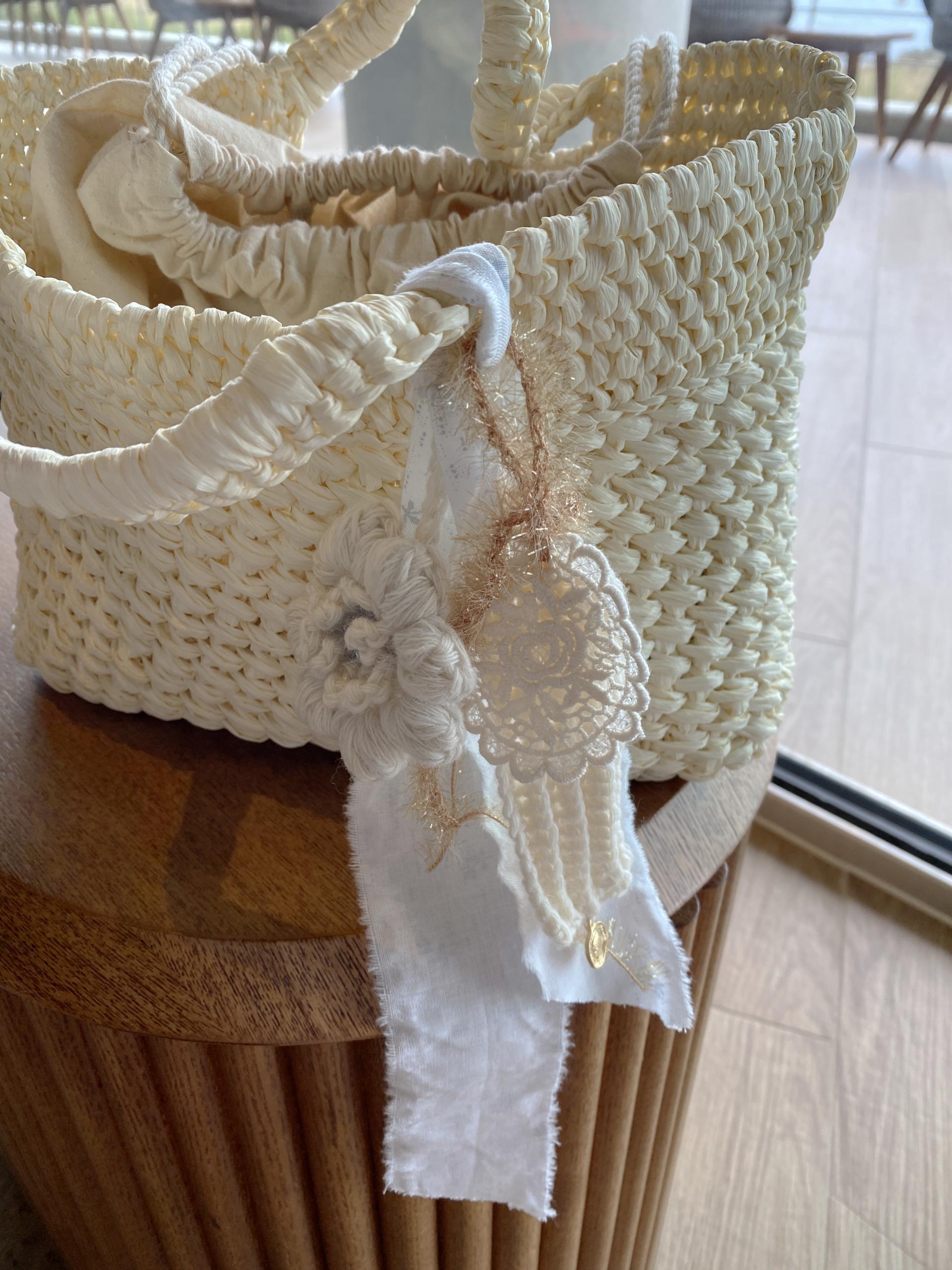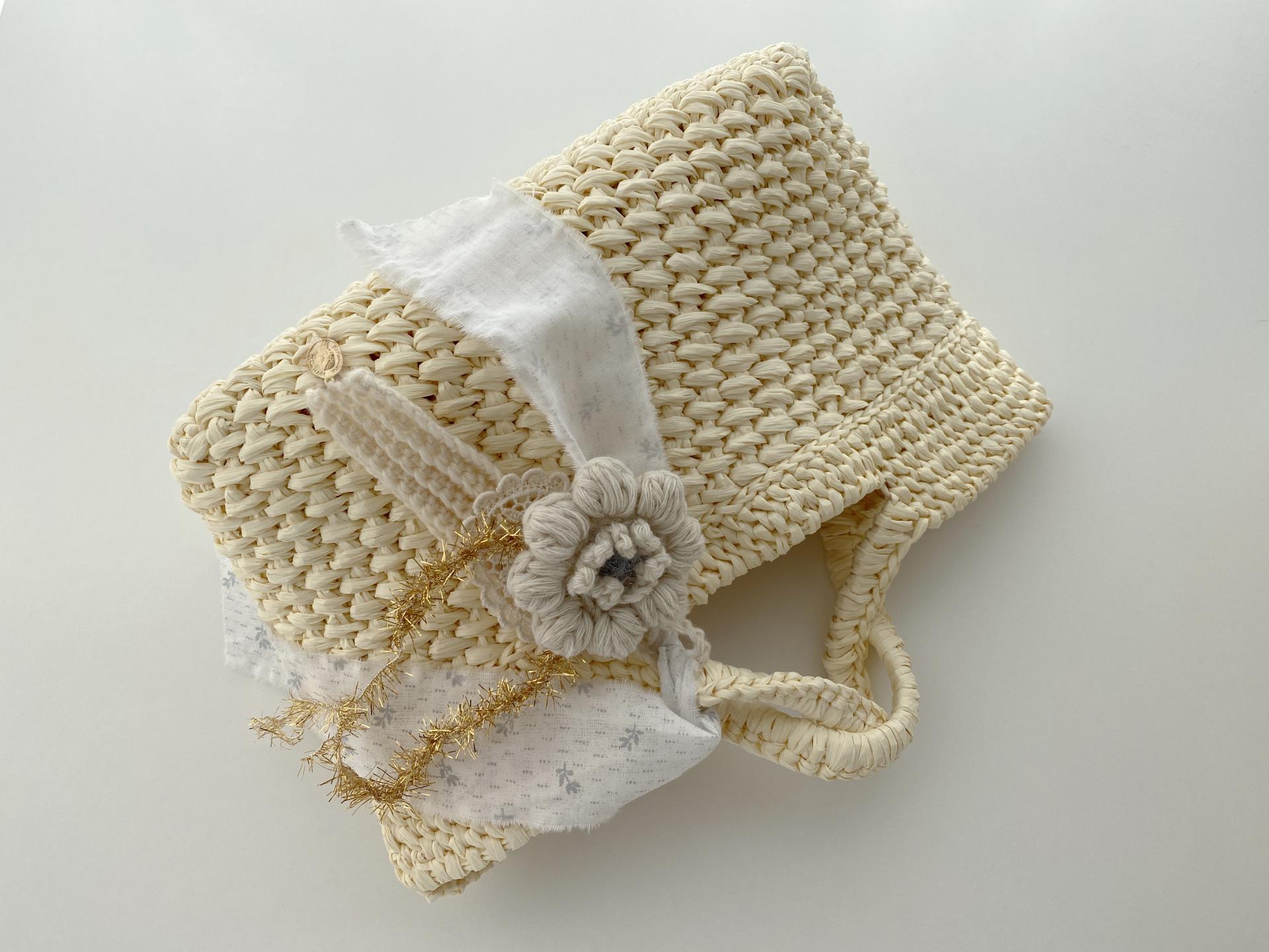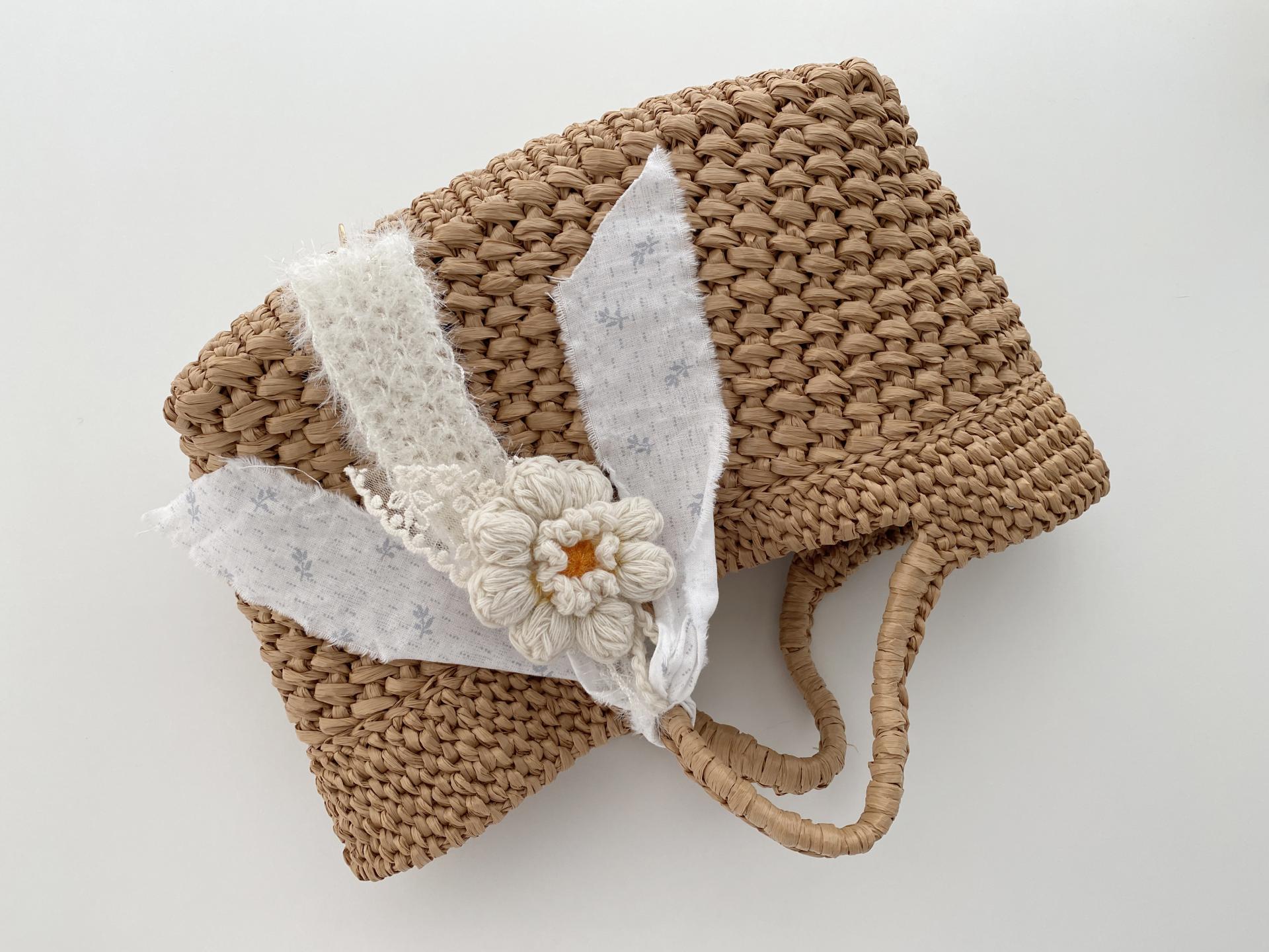 손잡이에 꽃장식과 천으로 리본을 연출하여 만드는 여성스러운 가방입니다.