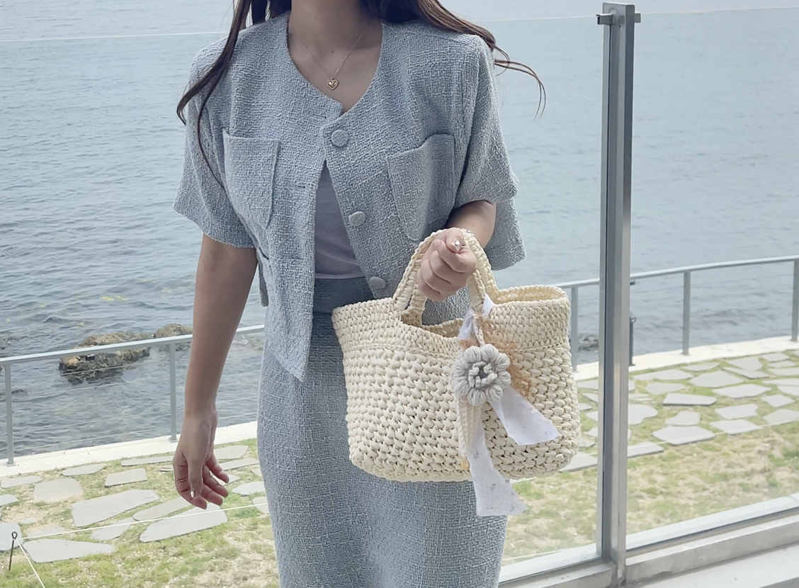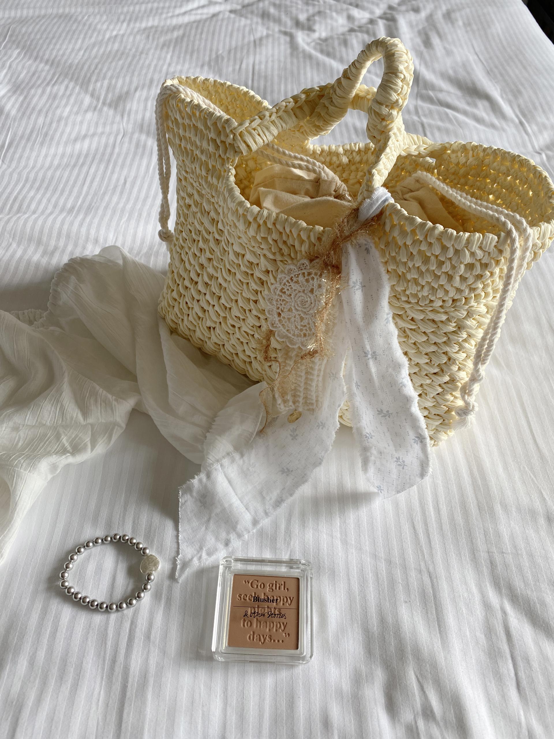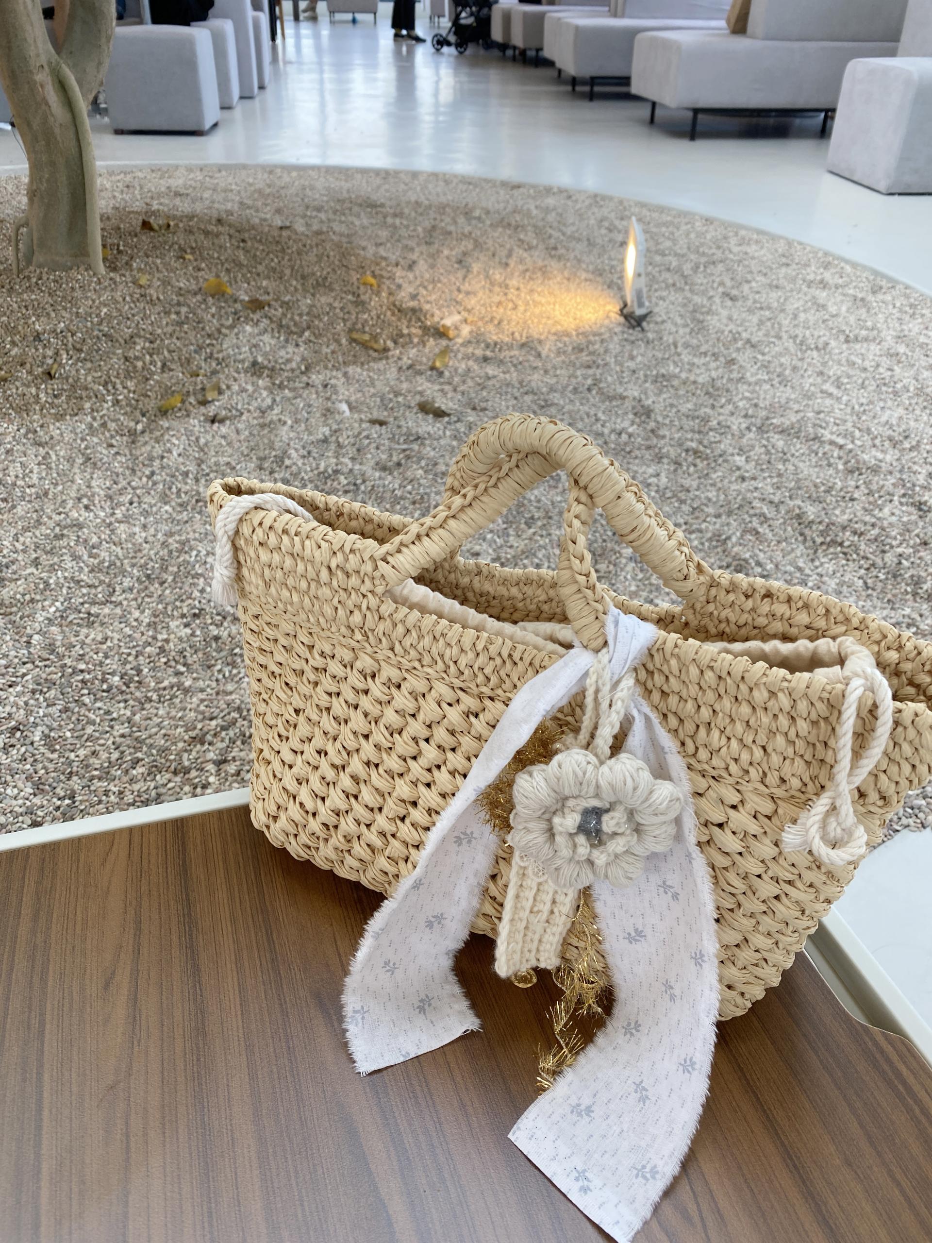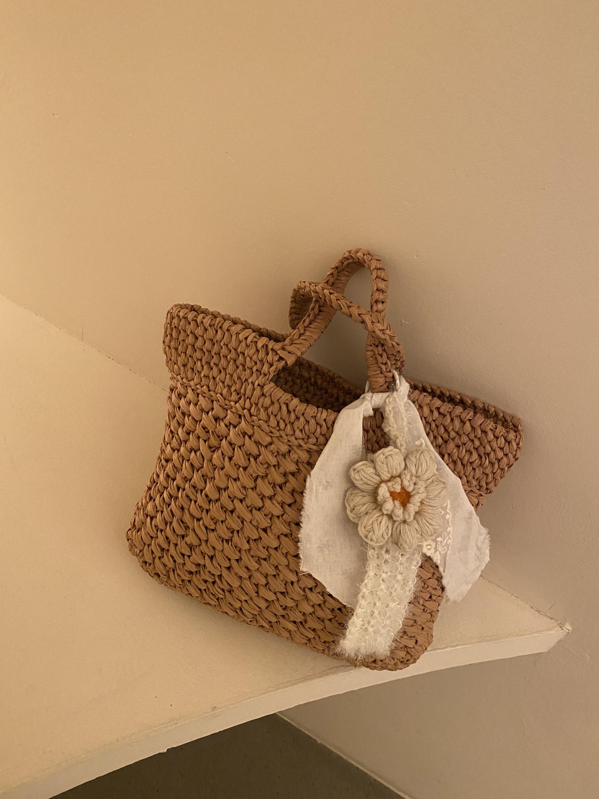 손잡이에 꽃장식과 천으로 리본을 연출하여 만드는 여성스러운 가방입니다.