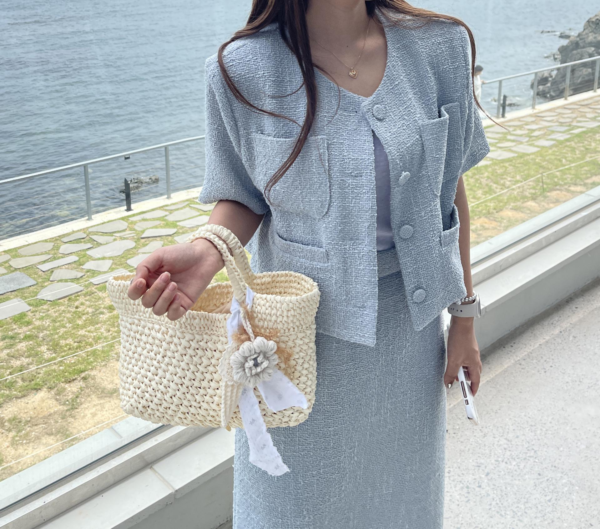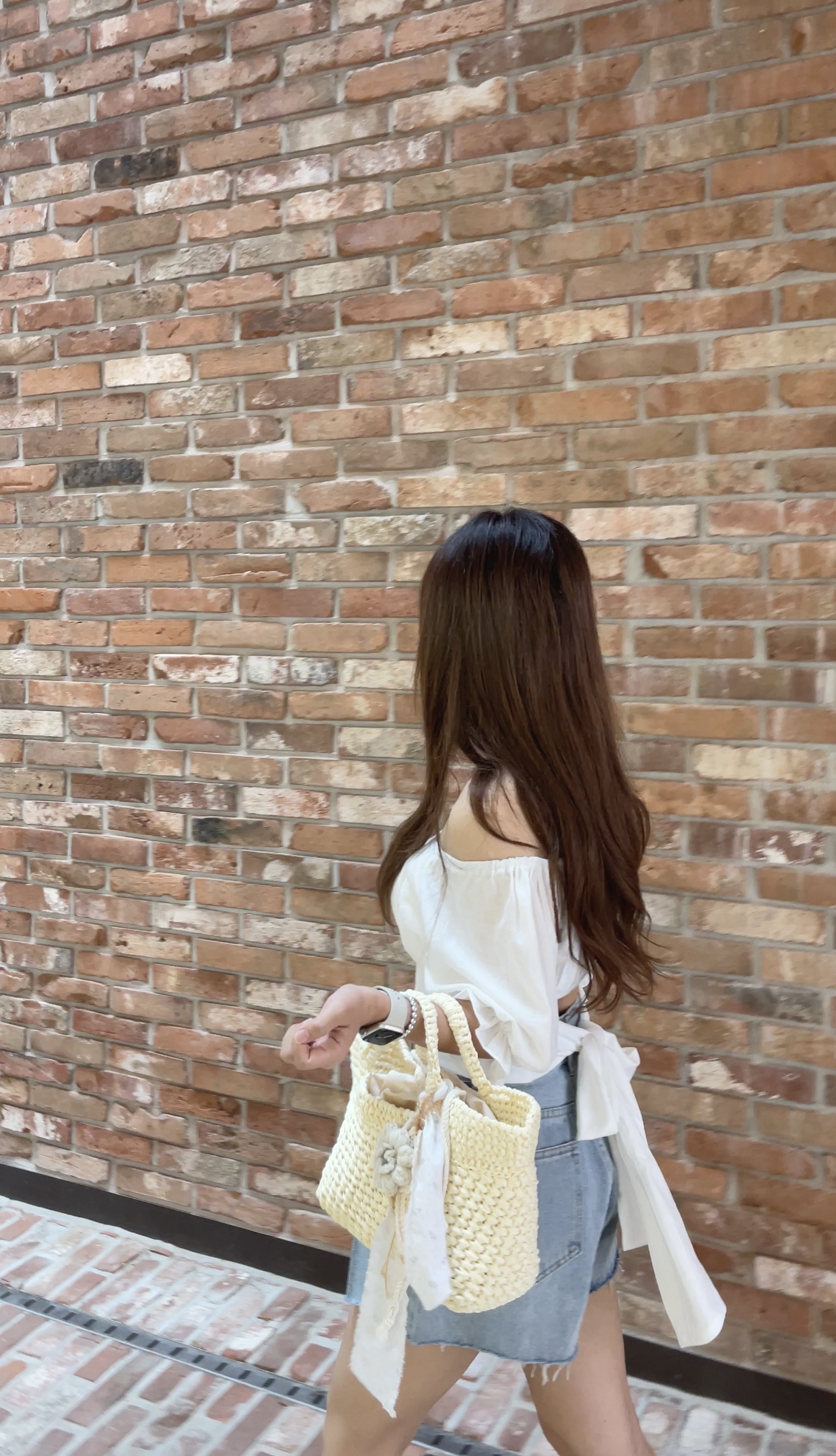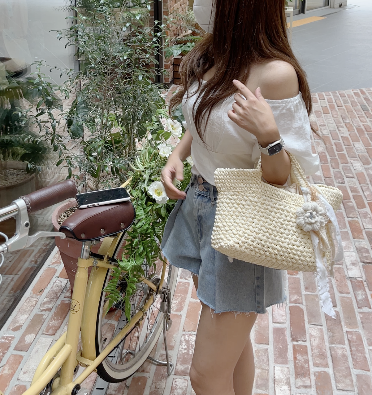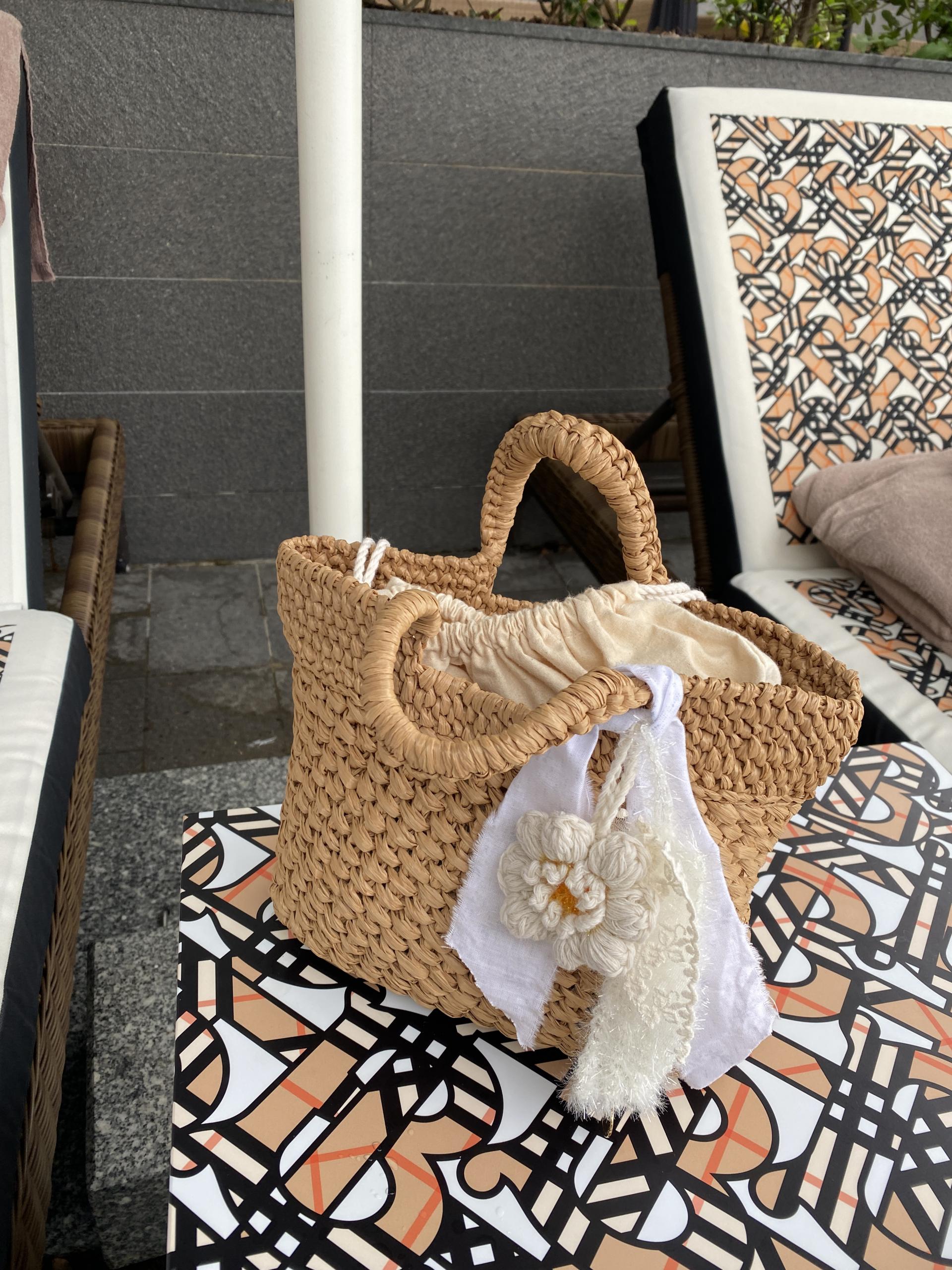 손잡이에 꽃장식과 천으로 리본을 연출하여 만드는 여성스러운 가방입니다.