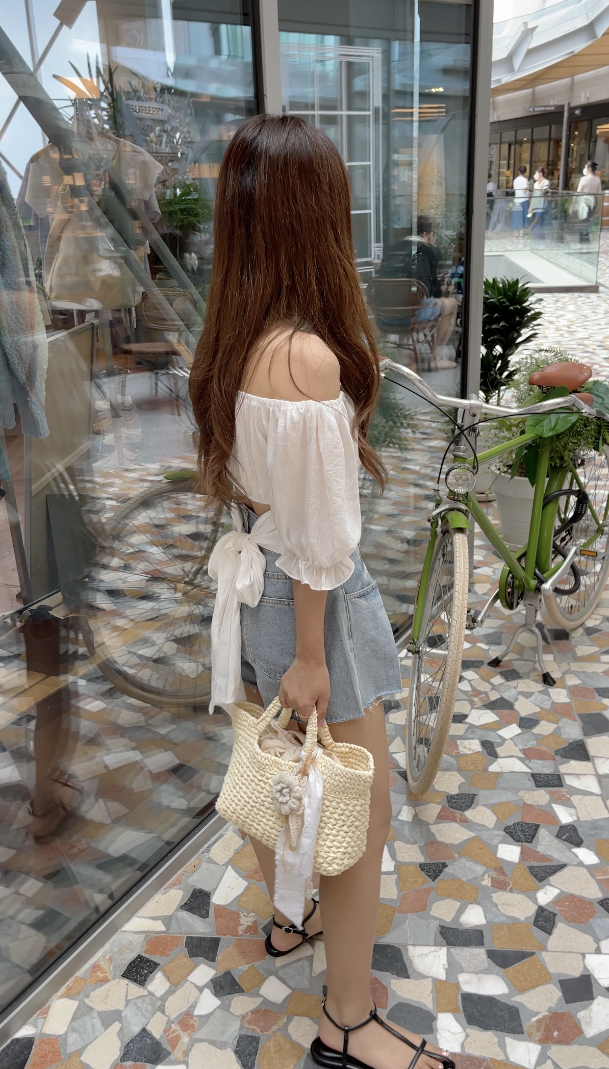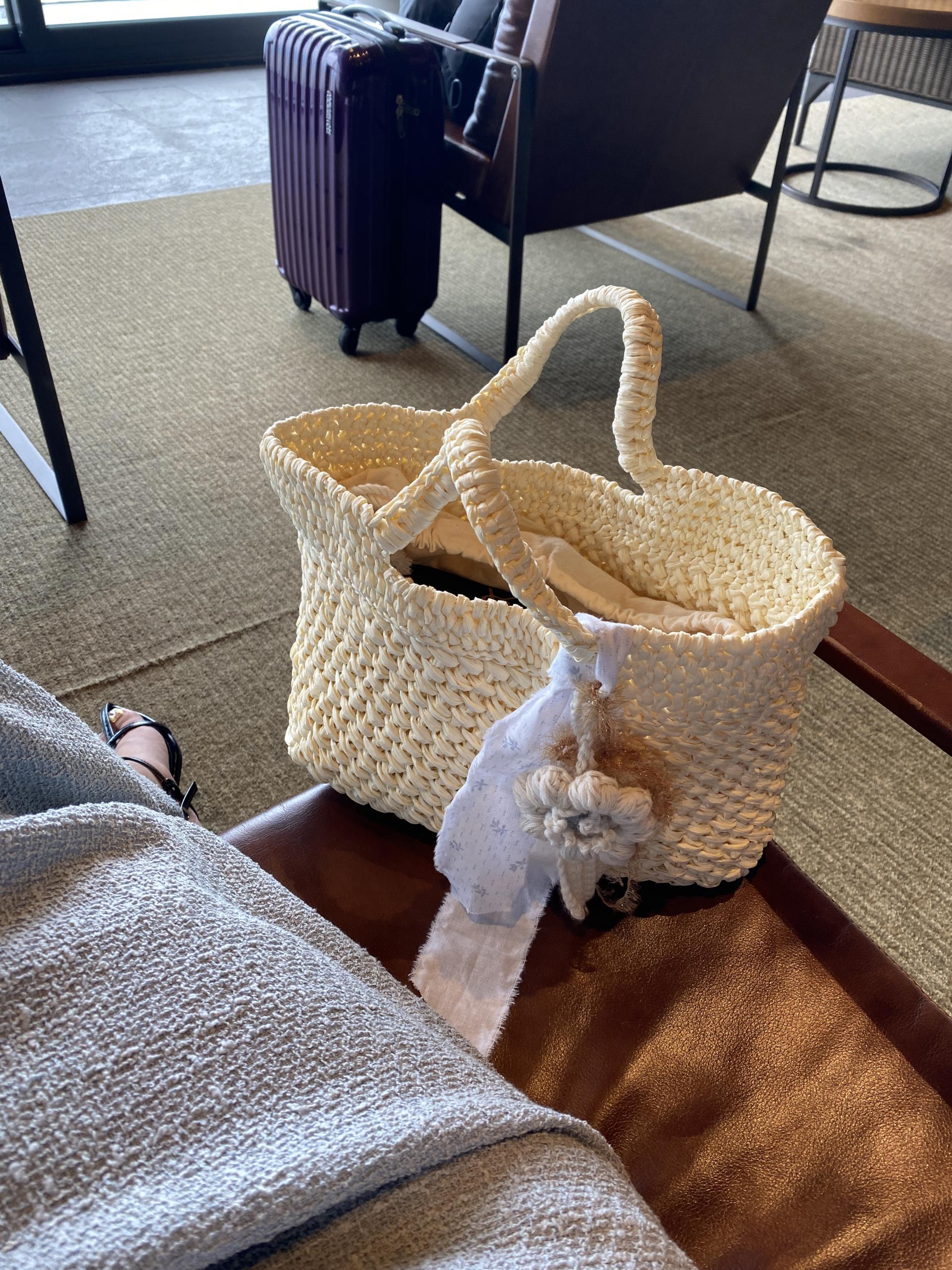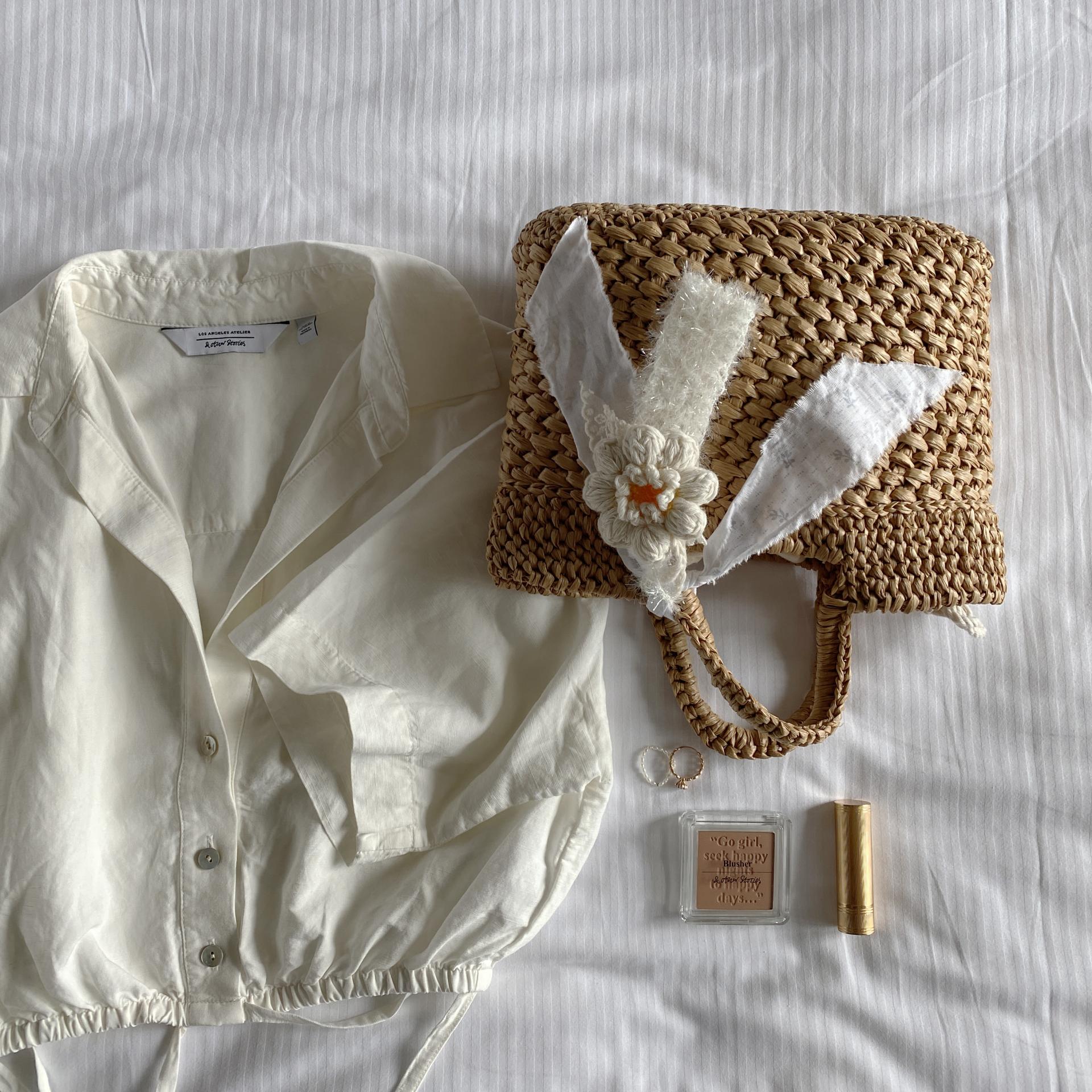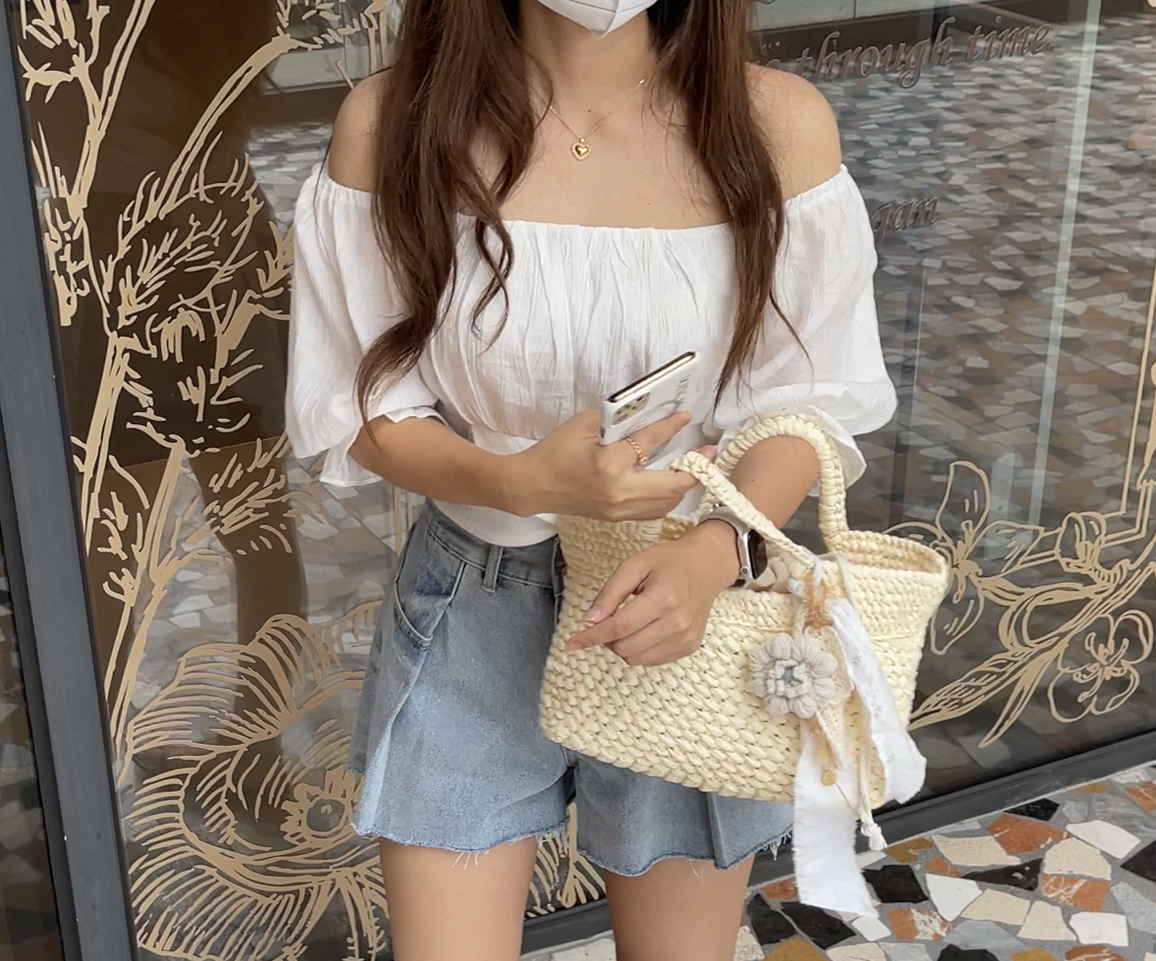 손잡이에 꽃장식과 천으로 리본을 연출하여 만드는 여성스러운 가방입니다.