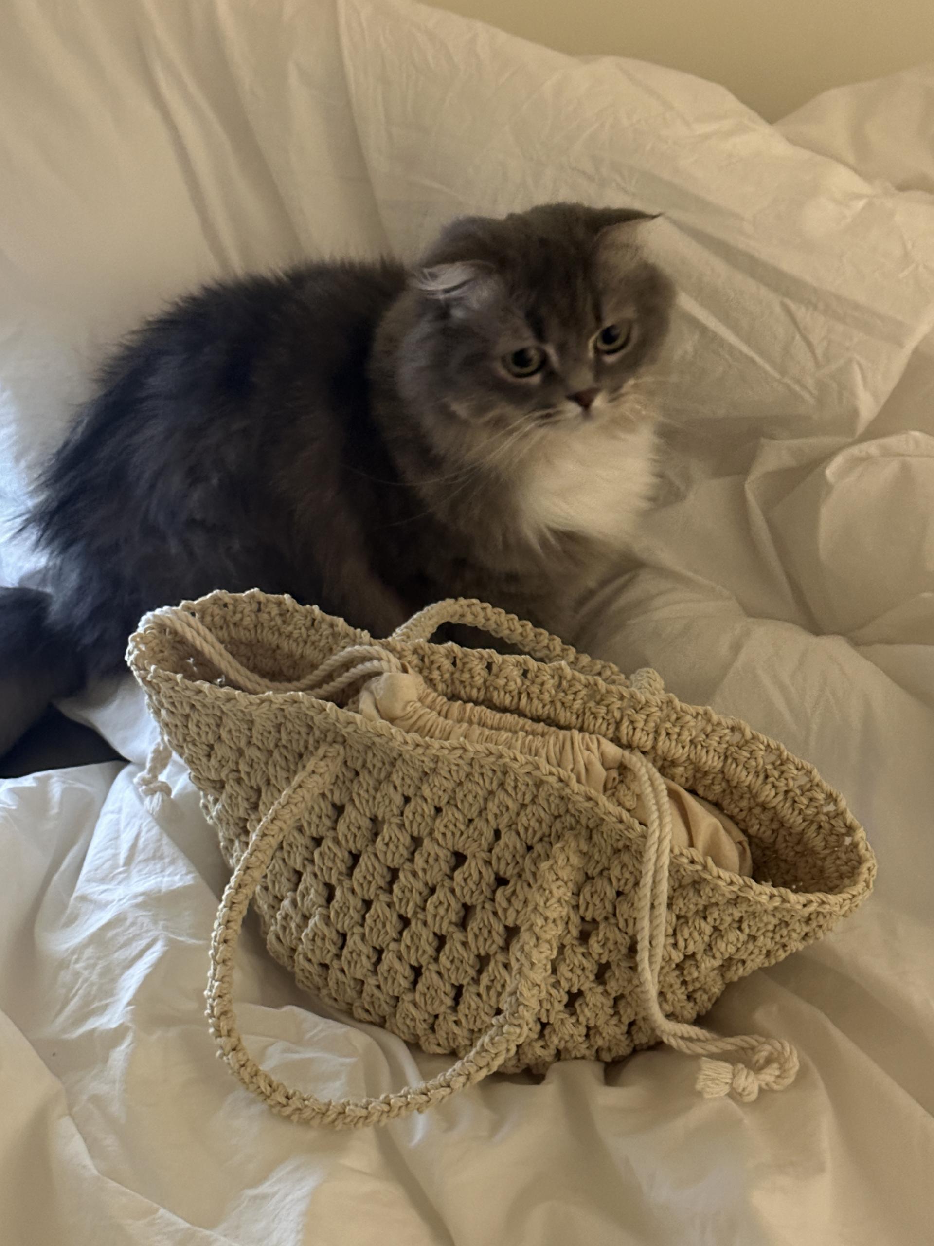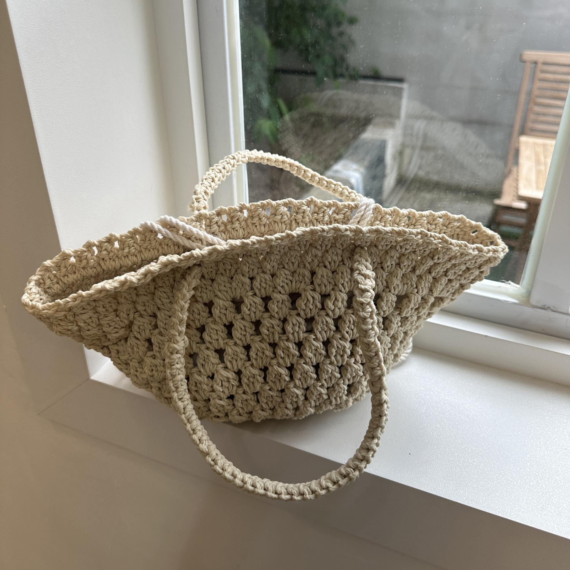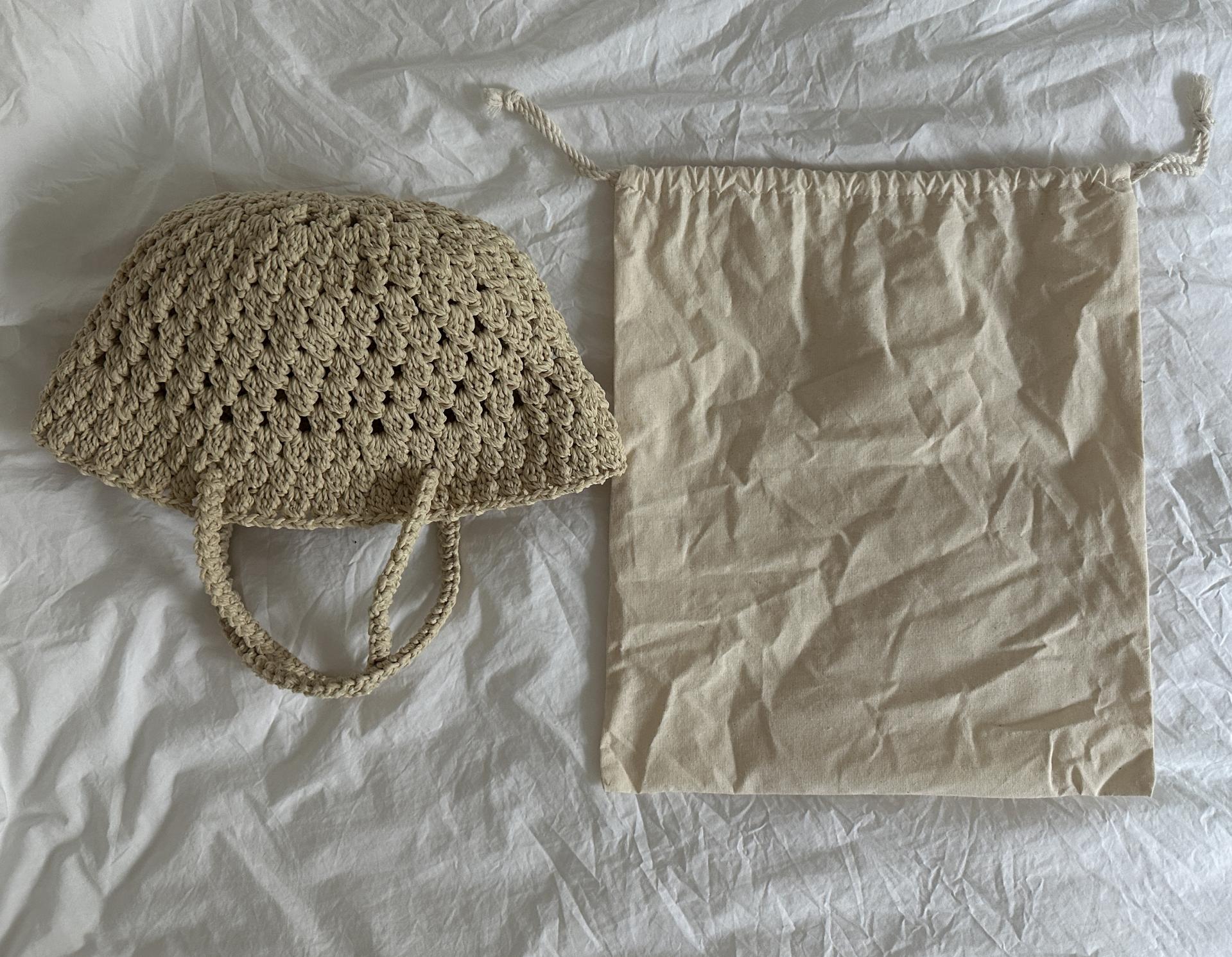네츄럴 레이온 소재의 실로 도톰하며 완성후에는 실 특유의 느낌으로 탄탄, 탱글탱글한 느낌으로 가방 각이 잘 잡혀요 :)